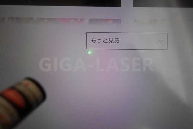 レーザー照射時はスイッチボタン上部のインジゲーターが緑に点灯。スイッチボタンは何回押しても指が痛くなりにくい造りで、カチカチと音もせずにスムースな押し心地(実用上ここはポイント高いです)。レーザースポットは2メートル先で直径1mmですが、若干の反射で、目視では1cm程度に見えます。尚、環境の明るさにより見え方は多少異なります。