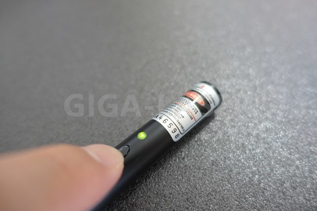 レーザー照射時はスイッチボタン上部のインジゲーターが緑に点灯。スイッチボタンは何回押しても指が痛くなりにくい造りで、カチカチと音もせずにスムースな押し心地(実用上ここはポイント高いです)。レーザースポットは2メートル先で直径1mmですが、若干の反射で、目視では1cm程度に見えます。尚、環境の明るさにより見え方は多少異なります。